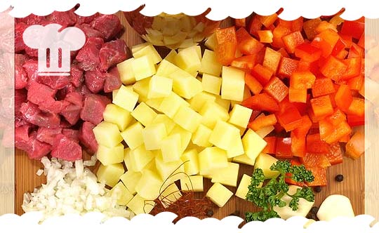 Geschmacksgeber für die "Original ungarische Gulaschsuppe" sind Knoblauch, Zitronenschale und Kümmel - Diese drei Zutaten fein hacken - etwas Butter dazunehmen um eine Art Würzpaste herzustellen. Die Chilischote halbieren, Kerne entfernen und fein hacken. Chili und Würzpaste nach Geschmack zugeben. Alles zugedeckt ca. 1 1/2 Stunden leicht köcheln lassen, bis das Fleisch fast weich ist. Die Kartoffel- und Paprikawürfel zugeben und fertigkochen. |
